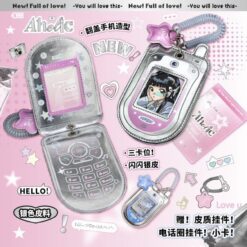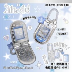 جاکارتی طرح موبایل با طراحی نوستالژیک، بدنه نقرهای براق و آویز ستاره در دو رنگ صورتی و آبی، انتخابی جذاب برای نگهداری کارت و فتوكارت است.